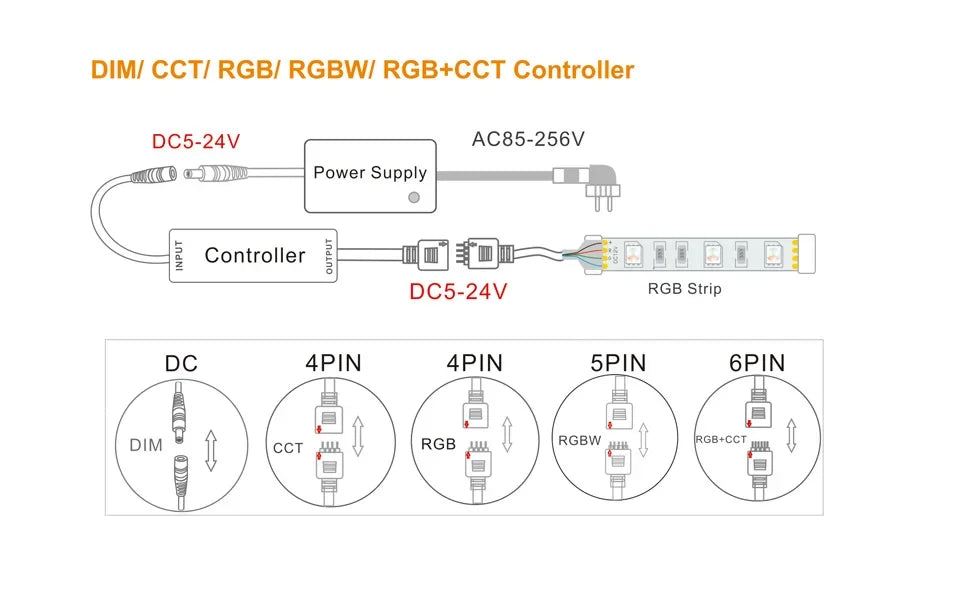 Upgrade your LED lighting experience with our RF LED Strip Light Controller, compatible with 2-pin, 3-pin, 4-pin, 5-pin, and 6-pin LED strips. This versatile controller supports a wide range of lighting configurations including Single Color (Dimmer), RGB, RGBW, and RGBCCT, making it the ideal solution for custom lighting installations in both residential and commercial spaces.
